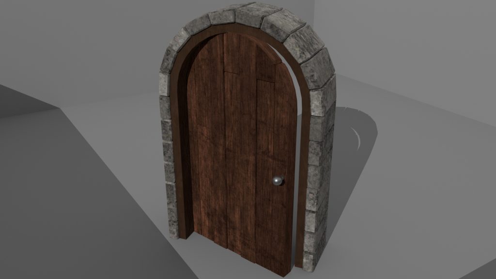 The door is made of marbled stone bricks surrounding a wooden frame and a wooden door, the planks are individually modelled in the same way as the floor and tabletops. The doorknob is iron although I understand that in a medieval scenario this may not have been historically accurate, this is a fantasy setting therefore I am choosing to disregard that. In the video the door appears closed, but I have modeled it open for these shots.