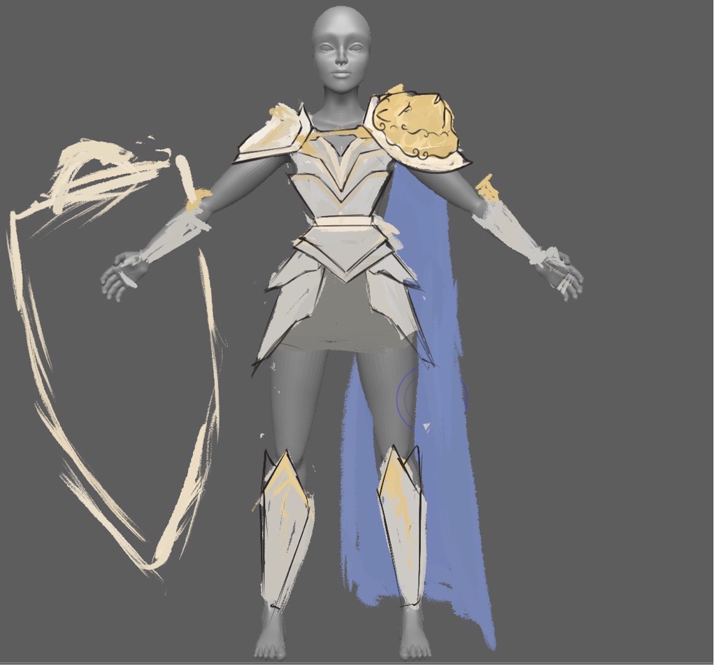 Across my time on this project, I created various unfinished pieces of concept art. I did not intend to complete these images, but rather, I produced them to explore ideas without modelling. Doing this helped me to settle on a design for the chest piece and leg armour. It also helped me to decide on the shape of the pauldron.
