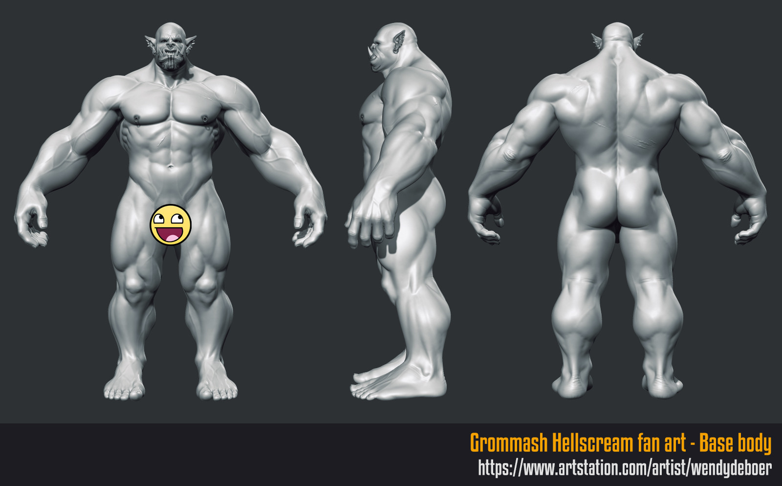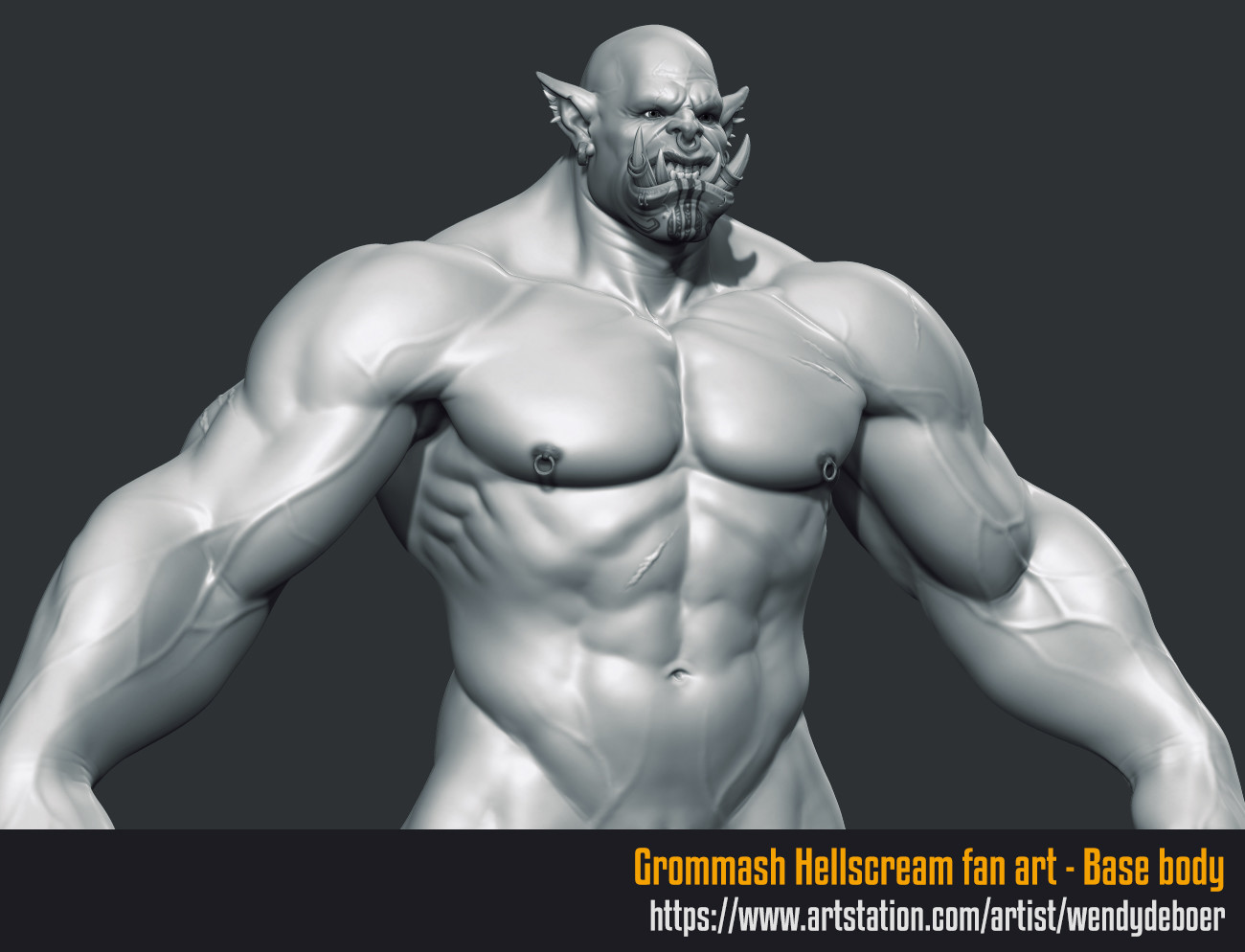 As pictured above, Orc anatomy is an exaggerated version of human anatomy. Their physical features are exaggerated to the extreme, including height, muscle density, muscle striations, veins, etc., which all emphasise their physical ability. In addition, their sheer width and height make them easily recognisable as fierce warriors.