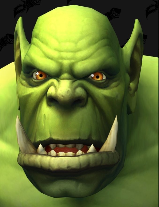 The Orc’s name is Hrugok, born to the Frostwolf clan in the frigid tundras of Alterac Valley. He stands tall and broad-shouldered, his muscular frame towering over most of his peers at nearly seven feet tall. His skin is a deep shade of green, tanned by the unforgiving sun and the biting cold.