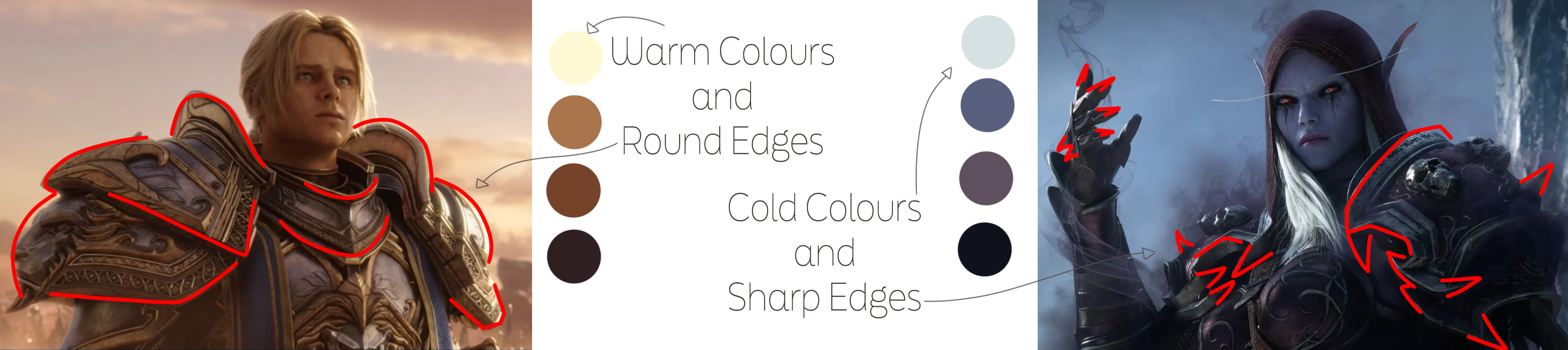 When looking at the examples above of models from the Warcraft franchise, in each example, the viewer can guess some backstories as well as the character’s current standing from the visual design. This is demonstrated through colour theory (Gold for royalty, desaturated colours for villains etc.), shape theory (soft shapes for good characters, square shapes for lawful characters, and sharp shapes for aggressive characters etc.), and other VFX (lighting, atmosphere etc.) and presentation (camera angle, focal length etc.).