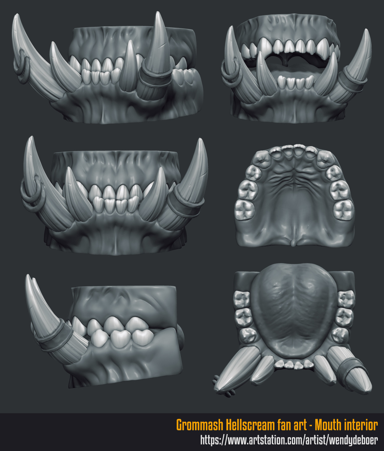 Looking at the teeth and mouths of Orcs, the first thing to notice is that their teeth, particularly their canines jut out prominently, the lower canines sitting at the front due to an underbite. This forward-thrusting lower jaw with elongated lower canines gives them their iconic “tusked” look. Orcs are also often depicted with embellishments on their teeth, including rings, carvings, and other accessories. Orcs are omnivores, so their front teeth are designed for ripping chunks of flesh off their kills, while their back teeth are similar to humans’ for grinding food. The Orc’s jaw anatomy and tooth shape are similar to those found in certain breeds of monkeys, making it relatively easy to get real-world references to assist with my sculpture.
