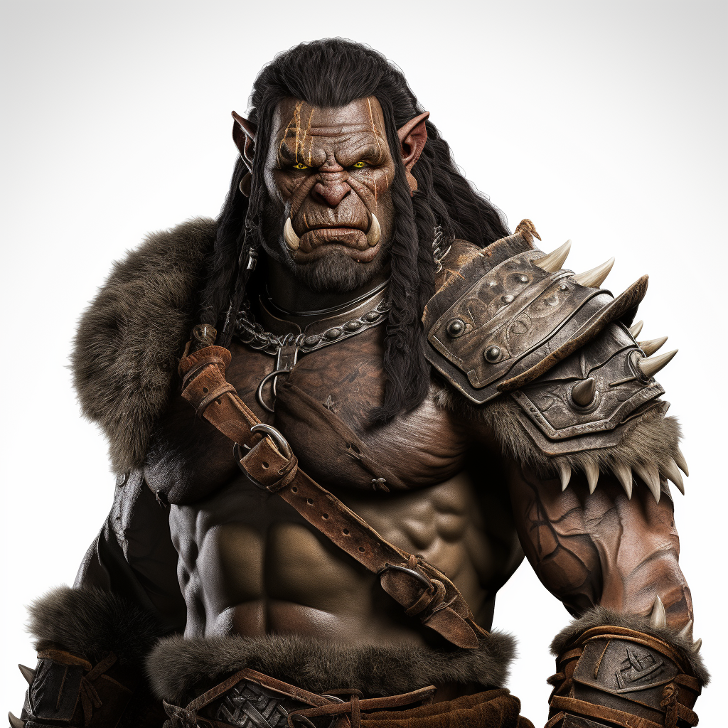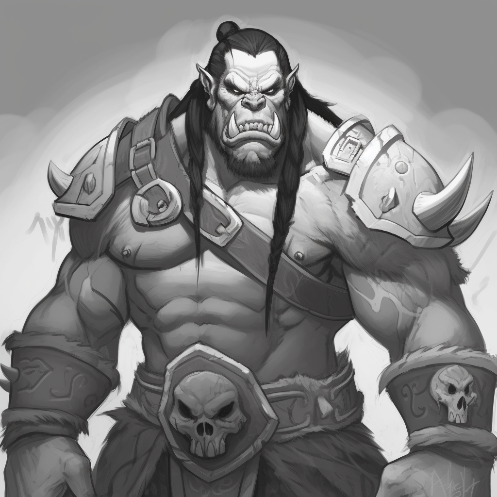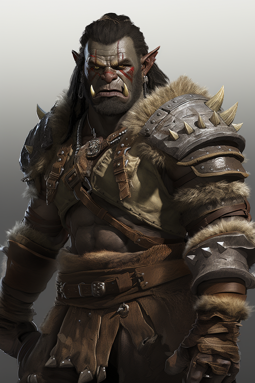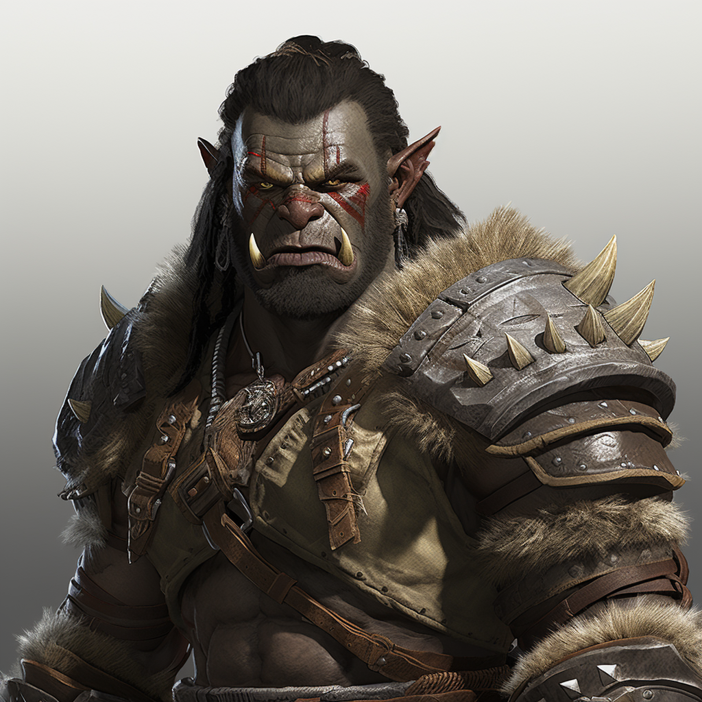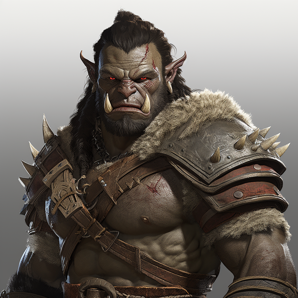 Grom’gar is an adult male Orc from the Frostwolf clan. He stands at an imposing height of seven feet and has a muscular build that speaks to his strength and power. He has thick, brown skin that is weathered and lined with scars, a testament to his many battles fought in the name of the Horde. His eyes are a striking amber color, bright and intense, with a keen intelligence that belies his ferocious appearance.