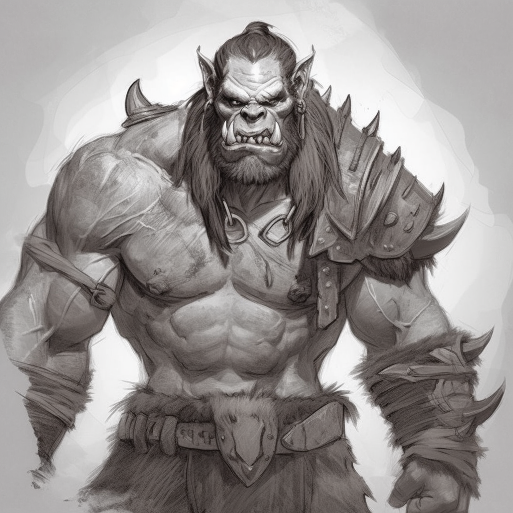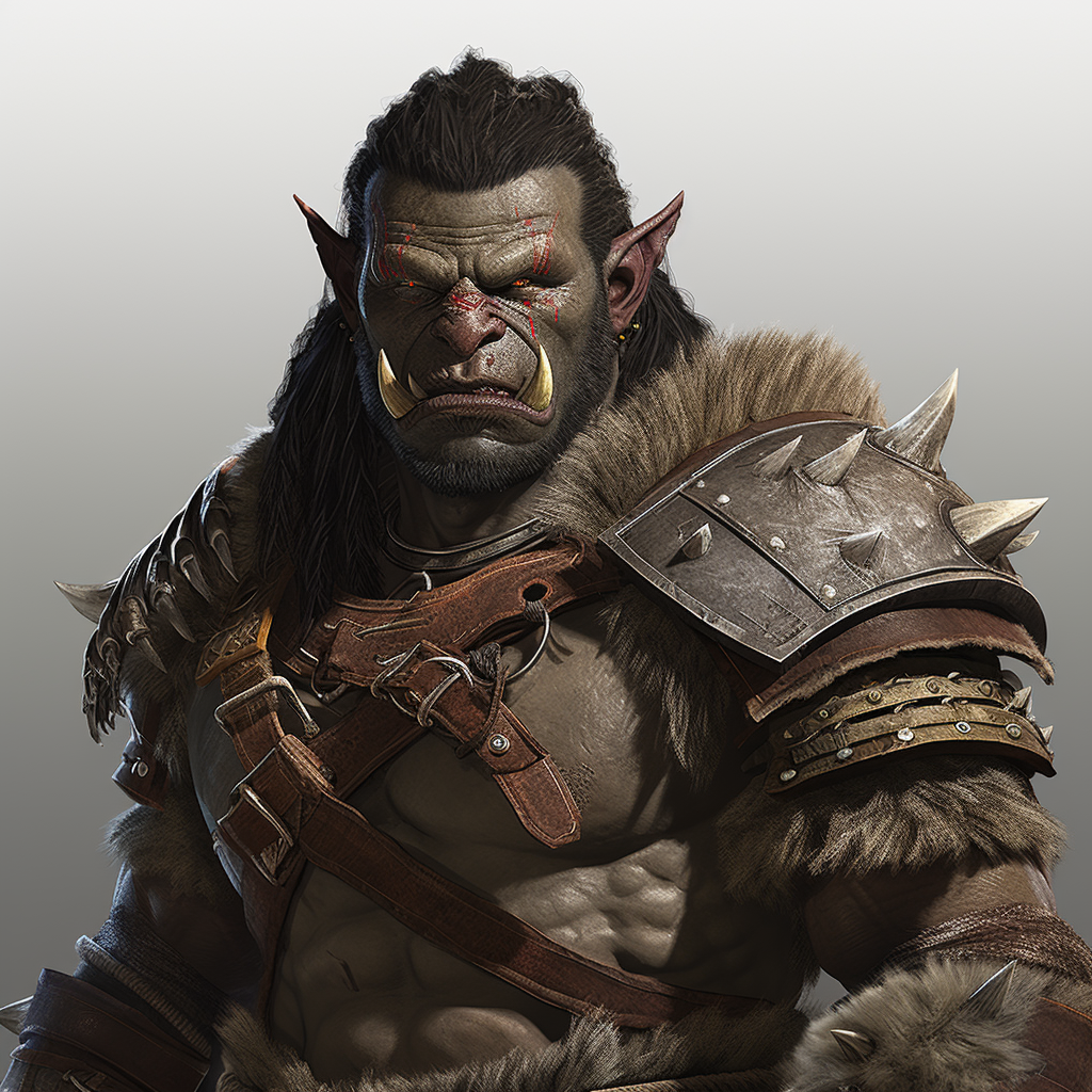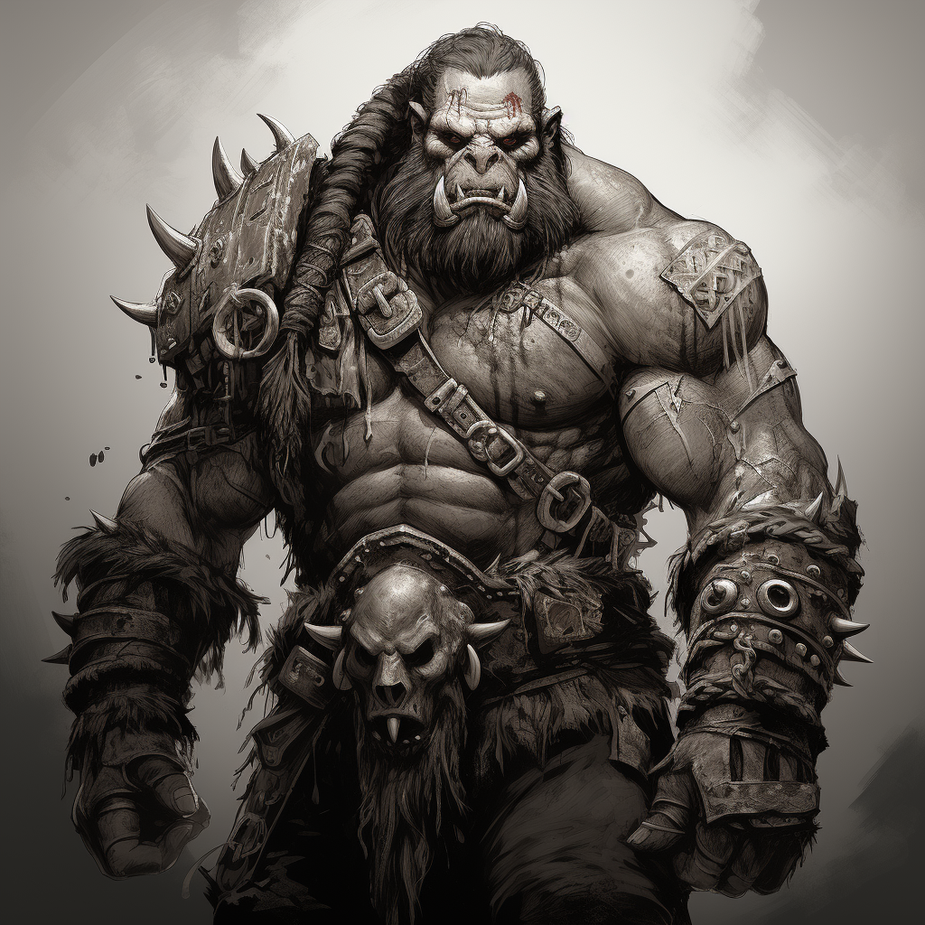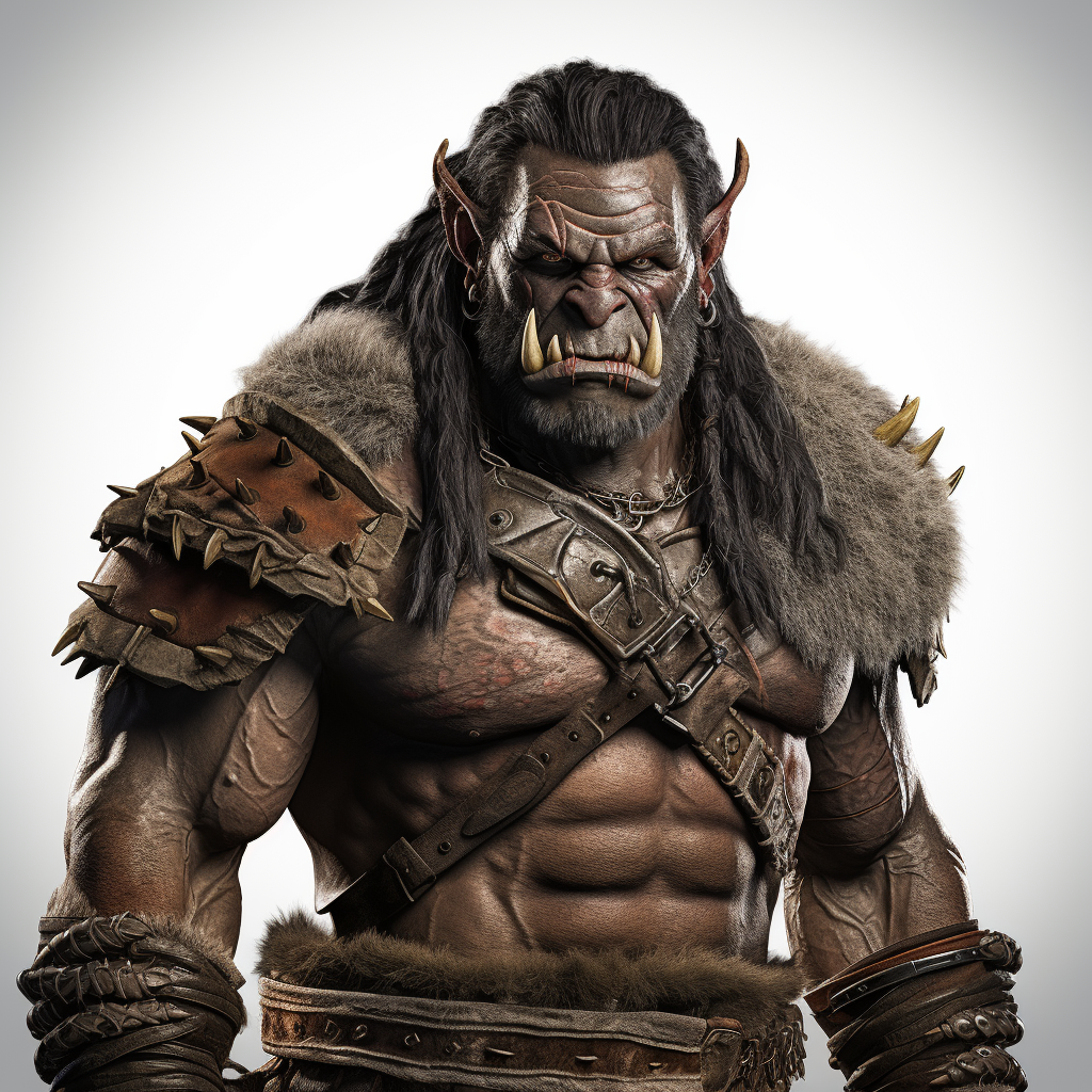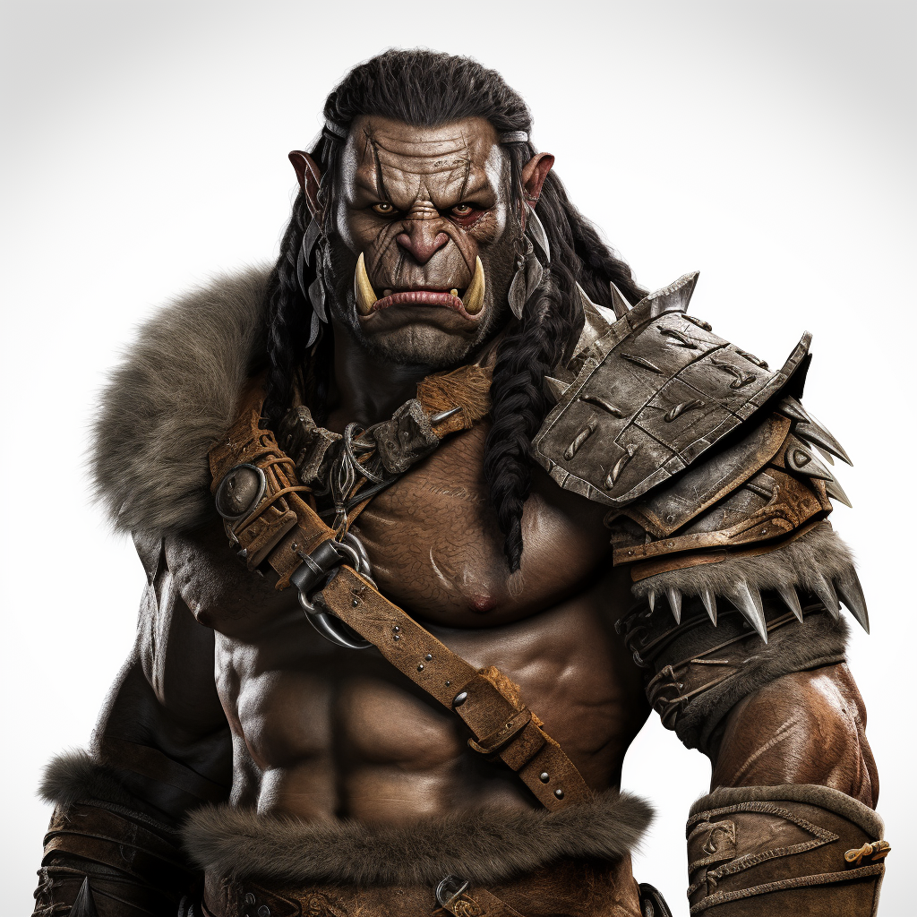 Grom’gar is an adult male Orc from the Frostwolf clan. He stands at an imposing height of seven feet and has a muscular build that speaks to his strength and power. He has thick, brown skin that is weathered and lined with scars, a testament to his many battles fought in the name of the Horde. His eyes are a striking amber color, bright and intense, with a keen intelligence that belies his ferocious appearance.