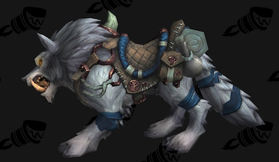 Frost wolves are a large breed of arctic wolf who share a homeland with the Frostwolf clan in Frostfire Ridge. Their pelts are typically a pale greyish-white colour with a slight blue tint and have a dense and insulating texture. “These wolves hunt with their orcish partners, keeping them warm when their clothes are not enough and alerting them about strangers. And in return, the clan makes sure the wolves are well fed, that their injuries are healed, and that their cubs need not fear predators scouring the mountains during the birthing times.” (Wowpedia, Frost Wolf)